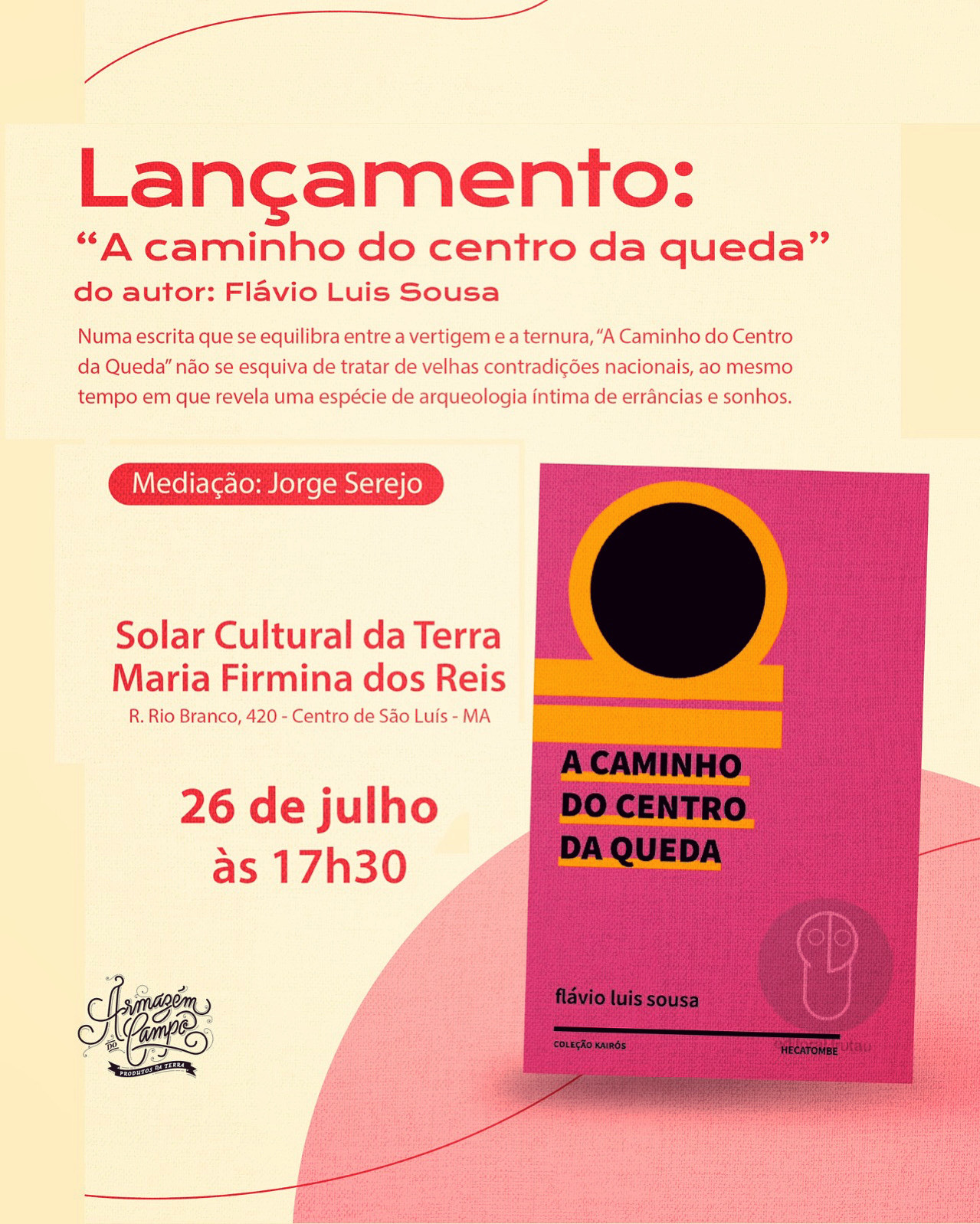 “A Caminho do Centro da Queda” é o primeiro romance do escritor Flávio Sousa que terá lançamento, com mediação de Jorge Serejo, ao final da tarde da próxima quarta-feira, 26, no Solar Cultural da Terra – Maria Firmina dos Reis (Rua Rio Branco – Centro Histórico). A obra foi publicada pela Ed. Hecatombe (selo político da Ed. Urutau), selecionada para integrar a coleção Kairós, em outubro de 2022.