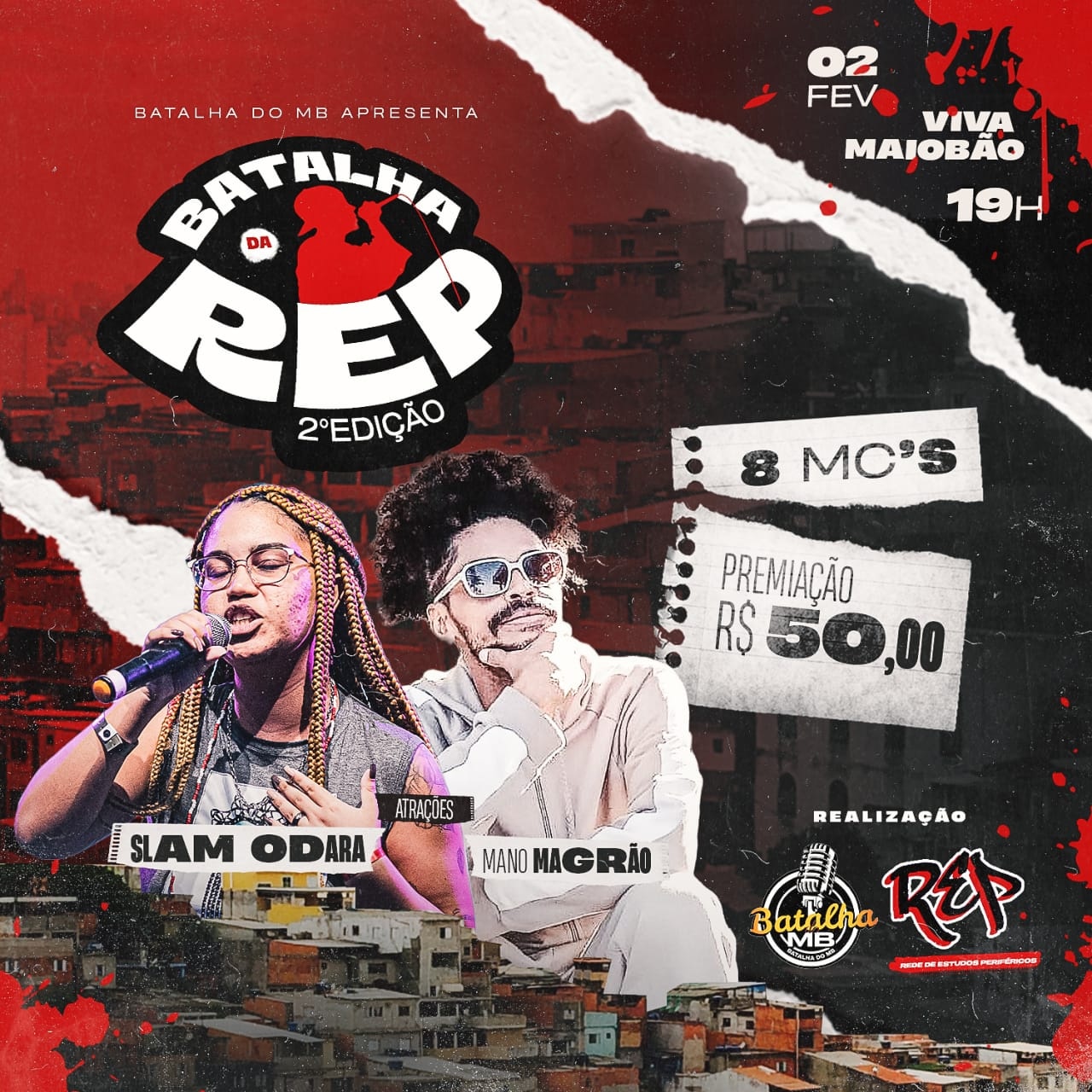 No próximo dia 02 de fevereiro, quinta-feira, às 19h, no Viva Maiobão – Paço do Lumiar, vai acontecer a segunda edição do “Batalha da REP” com a participação de oito MC´s e convidados especiais, como atrações: Slam Odara e Mano Magrão.