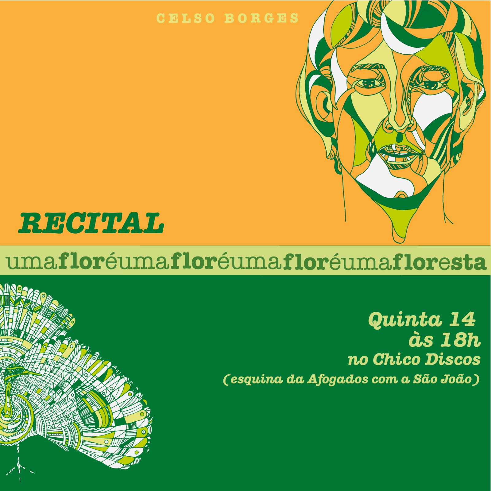 Umafloréumafloréumafloréumafloresta …. Em lua crescente no céu…Viva a poesia de Celso Borges nesta quinta-feira, às 18h, no Chico Discos, situado ali na esquina da rua dos Afogados com a rua São João, no Centro Histórico de São Luís.