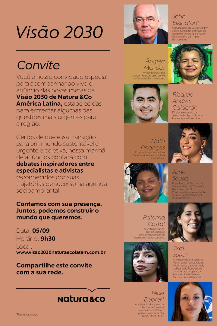 Novas metas da Visão 2030 de Natura &Co América Latina. O conteúdo será apresentado no encontro que contará com debates e conversas entre renomados ativistas e especialistas em questões socioambientais. Será no próximo dia 05, terça-feira, a partir das 9h30, com transmissão pelo site https://